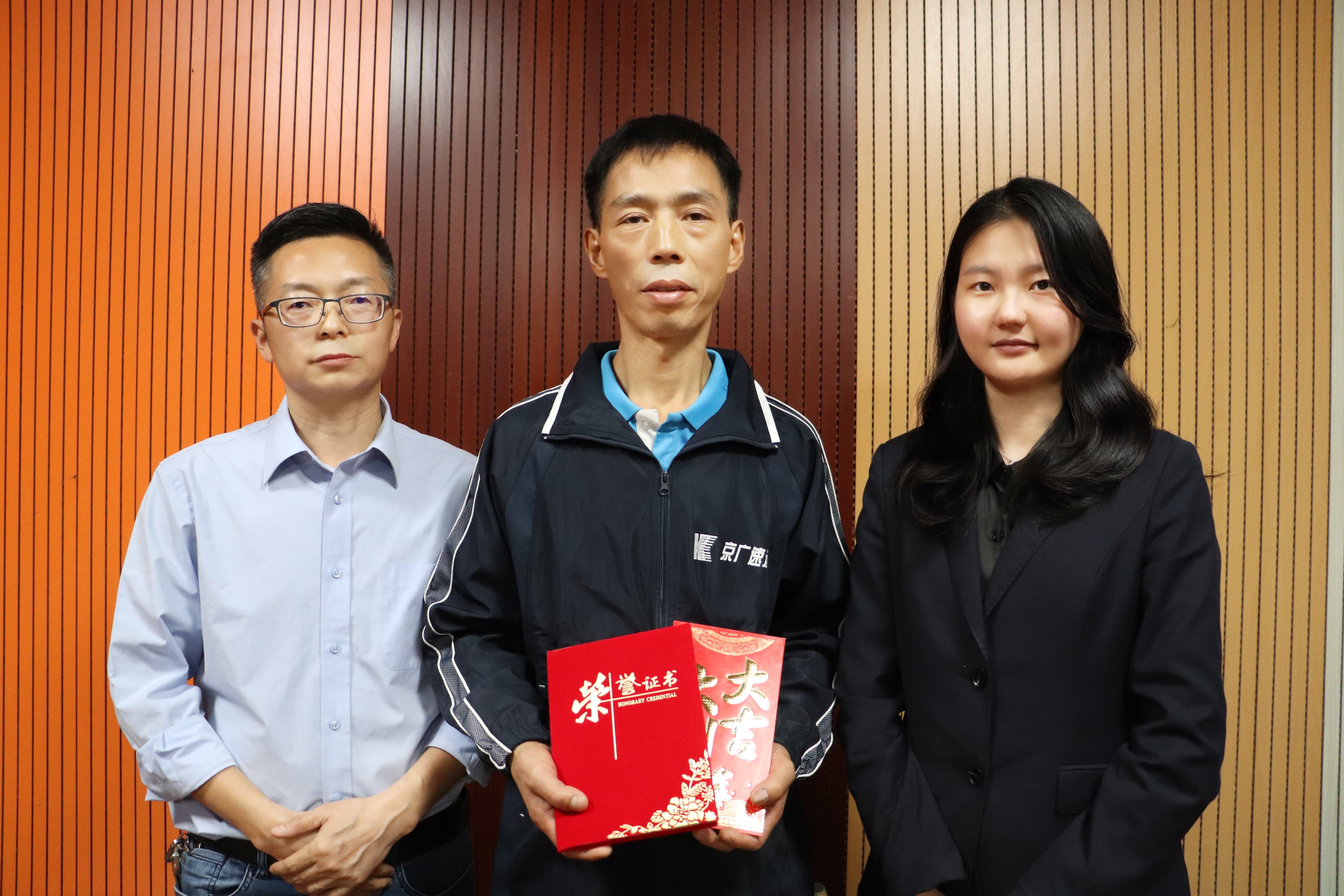 頒發(fā)“優(yōu)秀京廣人”證書和獎金,里水網(wǎng)點負責(zé)人汪東文(左),網(wǎng)管中心企劃部經(jīng)理趙亞丹(右)