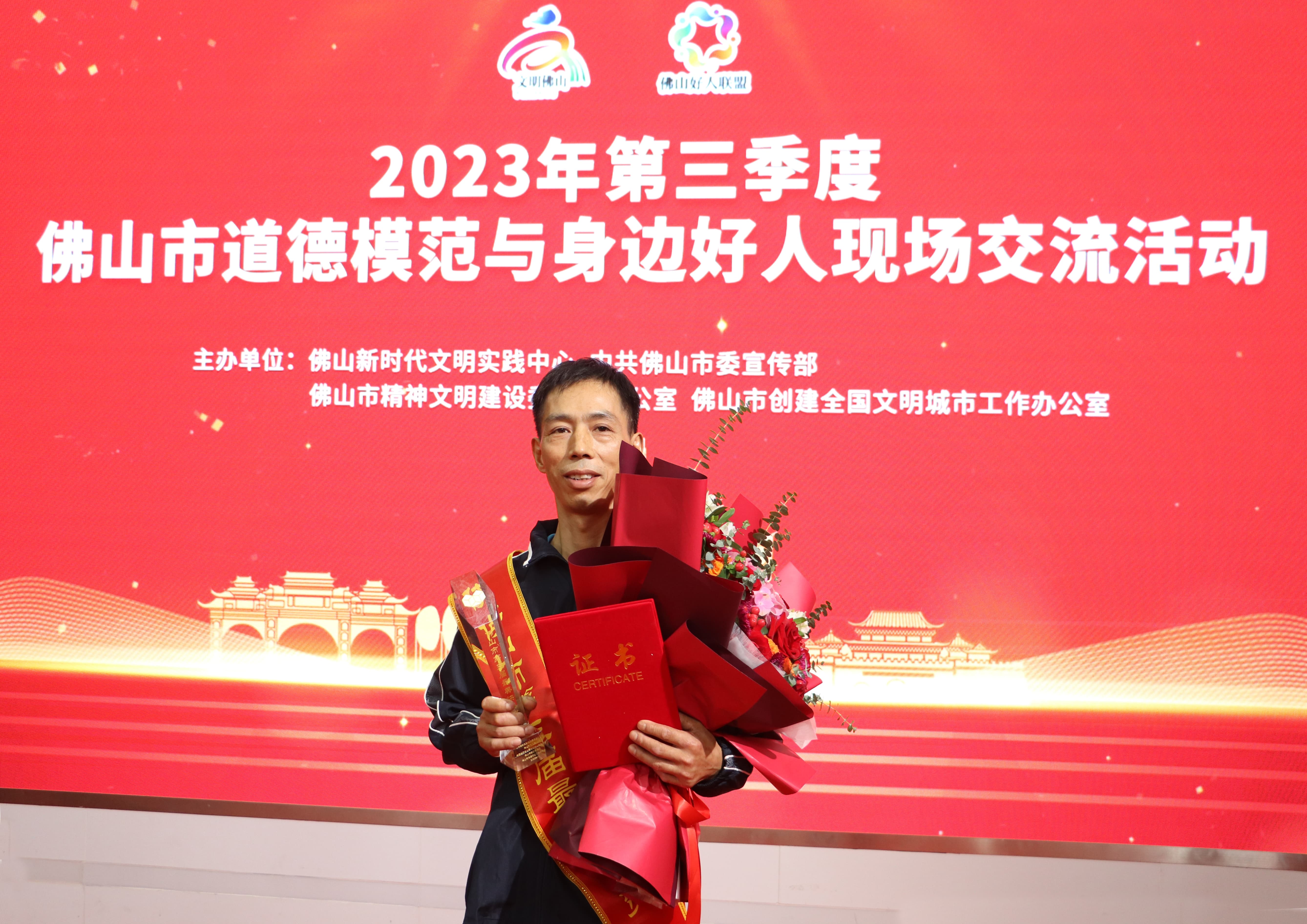 11月23日,2023年第三季度佛山市道德模范與身邊好人現(xiàn)場交流活動在佛山市新聞傳媒中心舉行。站在熒幕后臺等待出場的向利紅整齊地穿著京廣的深藍色外套,掛著“佛山市第三屆最美快遞員”的綬帶,室內(nèi)清涼,他的手心卻微不可察地沁出了一層薄汗。馬上,他就要和前后的優(yōu)秀同行一起,站在舞臺中央,接受佛山市郵管局領(lǐng)導(dǎo)的嘉獎。這是在京廣里水網(wǎng)點已經(jīng)工作了八年之久的老快遞人,人生中第一次站在這樣大的舞臺。
