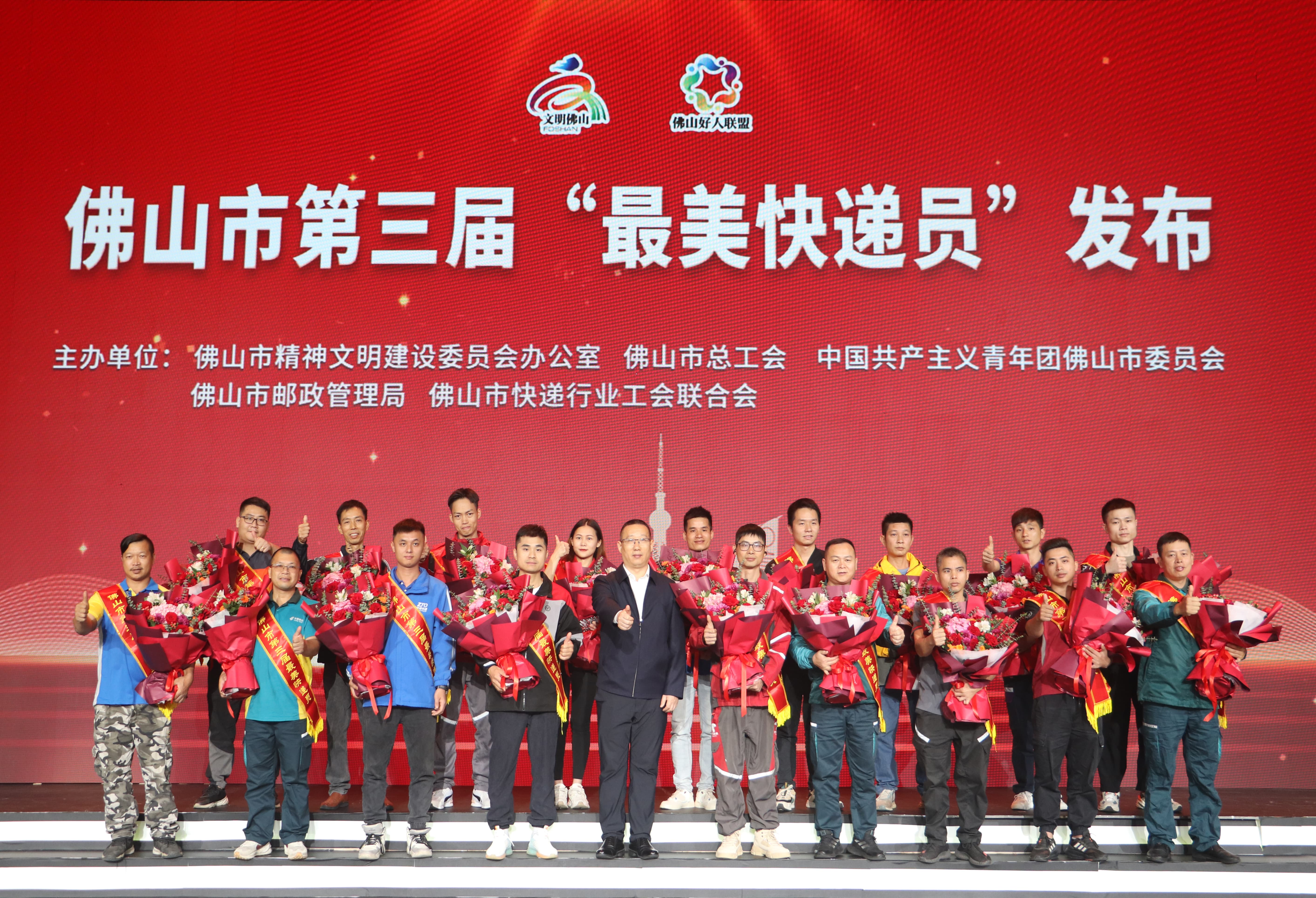 佛山市第三屆“最美快遞員”謝幕合照,向利紅(后排左二)高興地豎起了大拇指