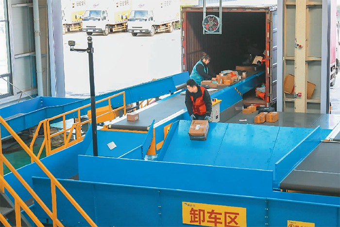 快遞包裝的輕量化、標(biāo)準(zhǔn)化能有效提高分揀效率。圖為日前,位于山東省東營(yíng)市的菜鳥(niǎo)網(wǎng)絡(luò)廣饒縣快遞集中配送中心,工作人員在分揀區(qū)進(jìn)行卸車、掃描等作業(yè)。劉云杰攝(人民視覺(jué))