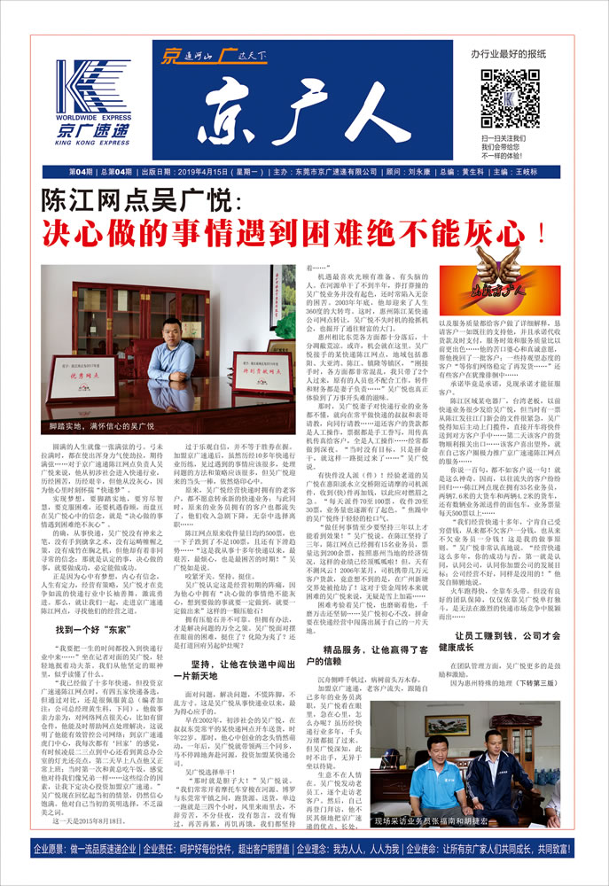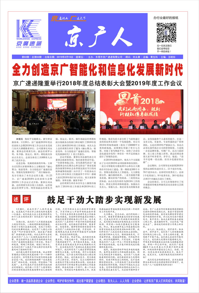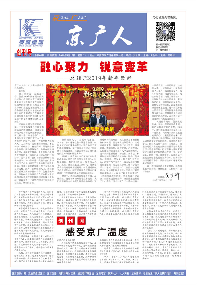 新年的第一縷陽(yáng)光普照大地,我們京廣人感受著2019年的溫暖。伴隨溫暖而來(lái)的,是我們打造企業(yè)文化的《京廣人》報(bào)出刊啦!從今天開(kāi)始,我們京廣人擁有了自己的報(bào)紙,擁有了自己的傳媒,擁有了敞開(kāi)心扉的文化平臺(tái)!