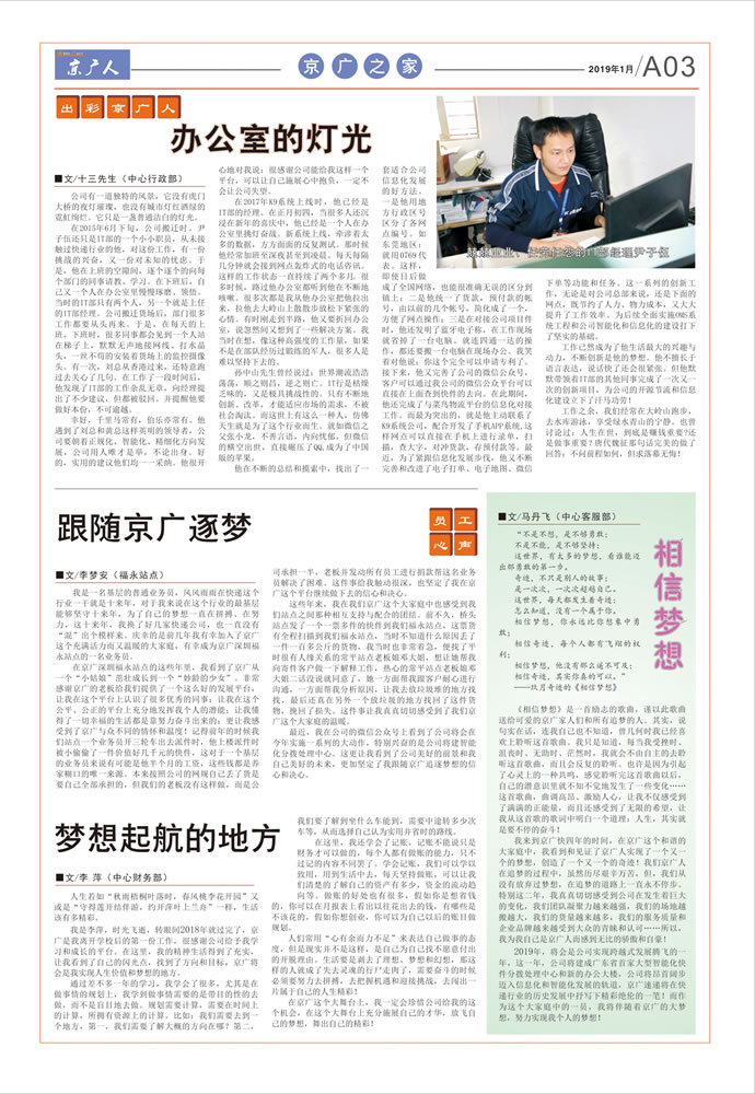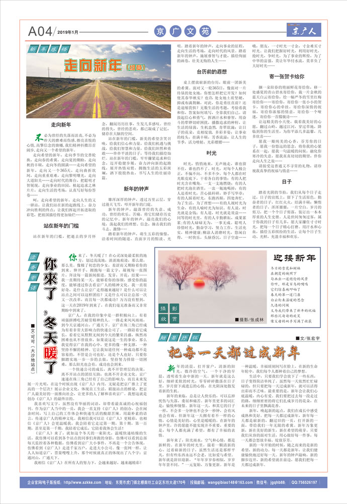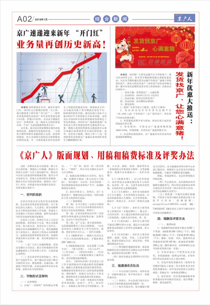新年的第一縷陽光普照大地,我們京廣人感受著2019年的溫暖。伴隨溫暖而來的,是我們打造企業(yè)文化的《京廣人》報(bào)出刊啦!從今天開始,我們京廣人擁有了自己的報(bào)紙,擁有了自己的傳媒,擁有了敞開心扉的文化平臺(tái)!不管是城市高樓玉宇,還是鄉(xiāng)間曲折小道,我們京廣人一直奮力奔跑,競(jìng)相傳遞“我為人人,人人為我”的經(jīng)營(yíng)理念。這是溫情感染。這是溫暖交融。溫暖產(chǎn)生磅礴力量,溫暖煥發(fā)勃勃生機(jī)。因?yàn)槲覀冃睦镅b著“呵護(hù)好每份快件